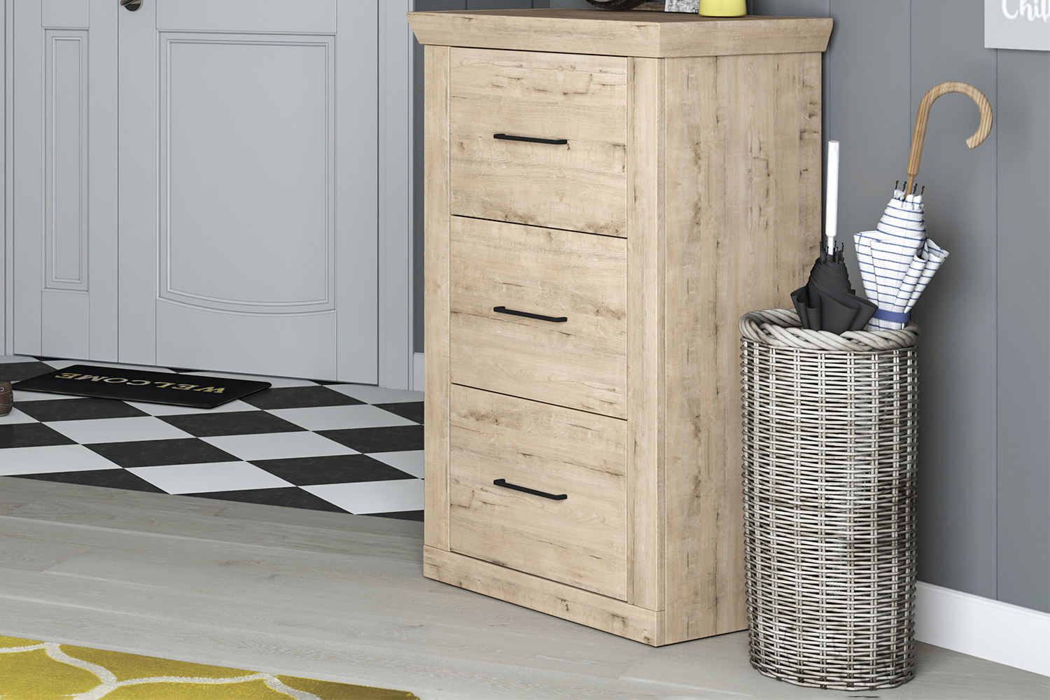 - Тумба для обуви с тремя секциями за откидными дверями;