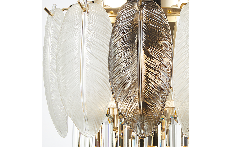 Отображение природных мотивов в предметах интерьера всегда выглядит утонченно и изящно. Это можно сказать и о нашей коллекции Dolor. Каркас коллекции в цвете золота оформлен декоративными лепестками из белого и серого стекла, которые обрамляют хрустальный водопад кристаллов высшего качества прямоугольной формы.