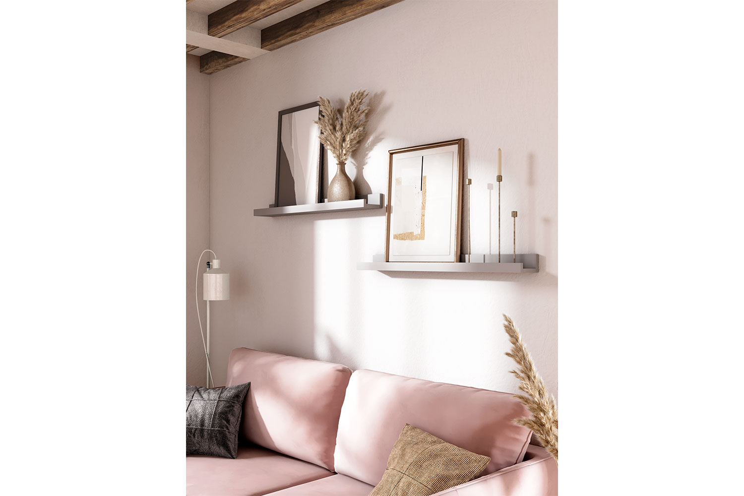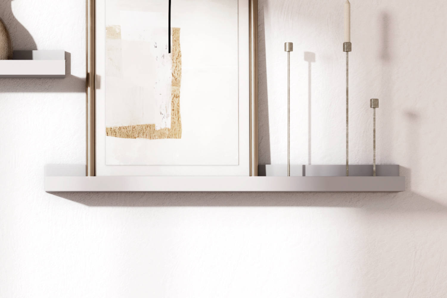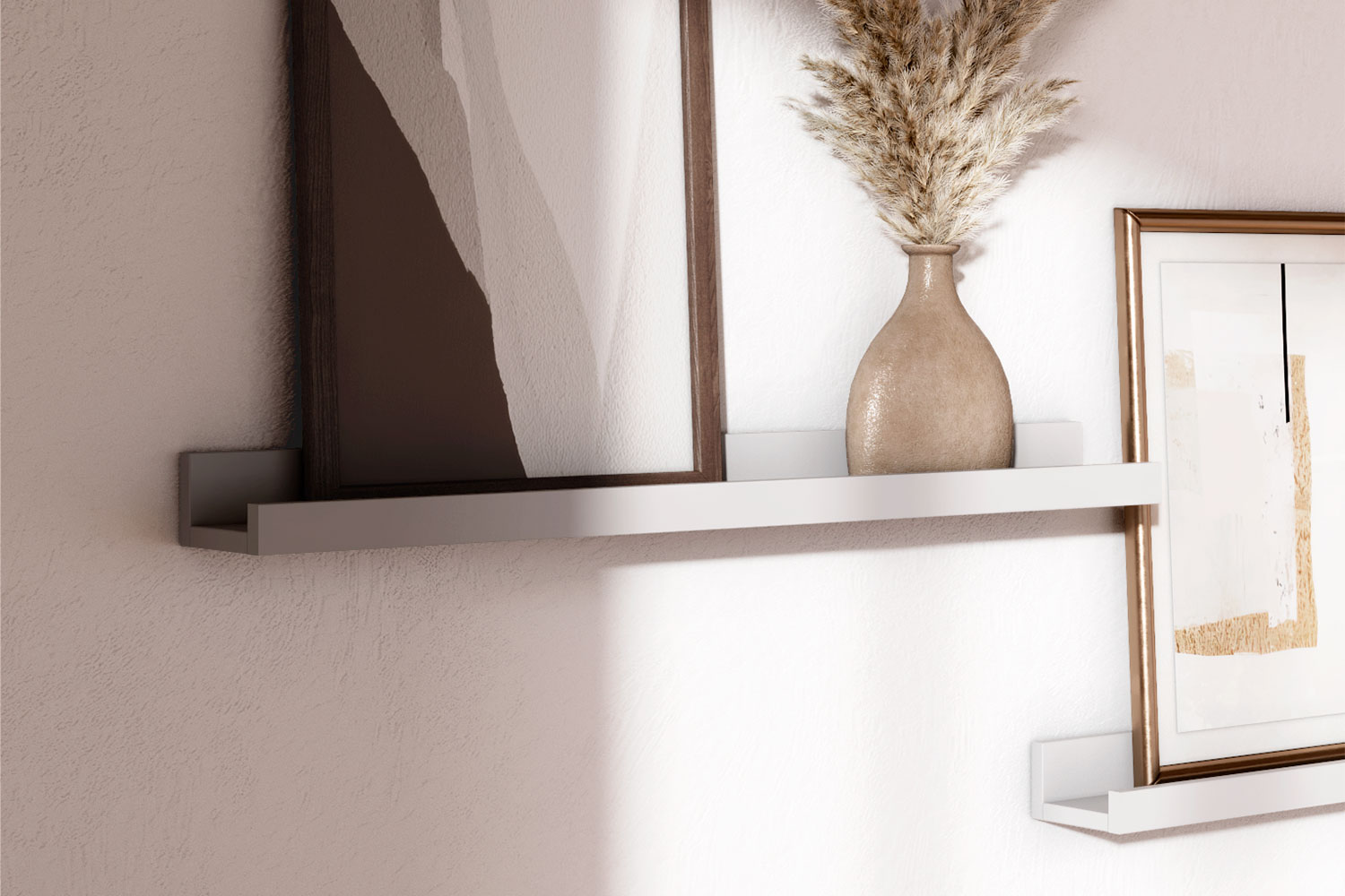 Полку можно использовать в композиции — комбинировать несколько вариантов размеров, чтобы создать настоящую галерею семейных фотографий или картин. Передний ограничительный профиль не даст соскользнуть предметам с полки.