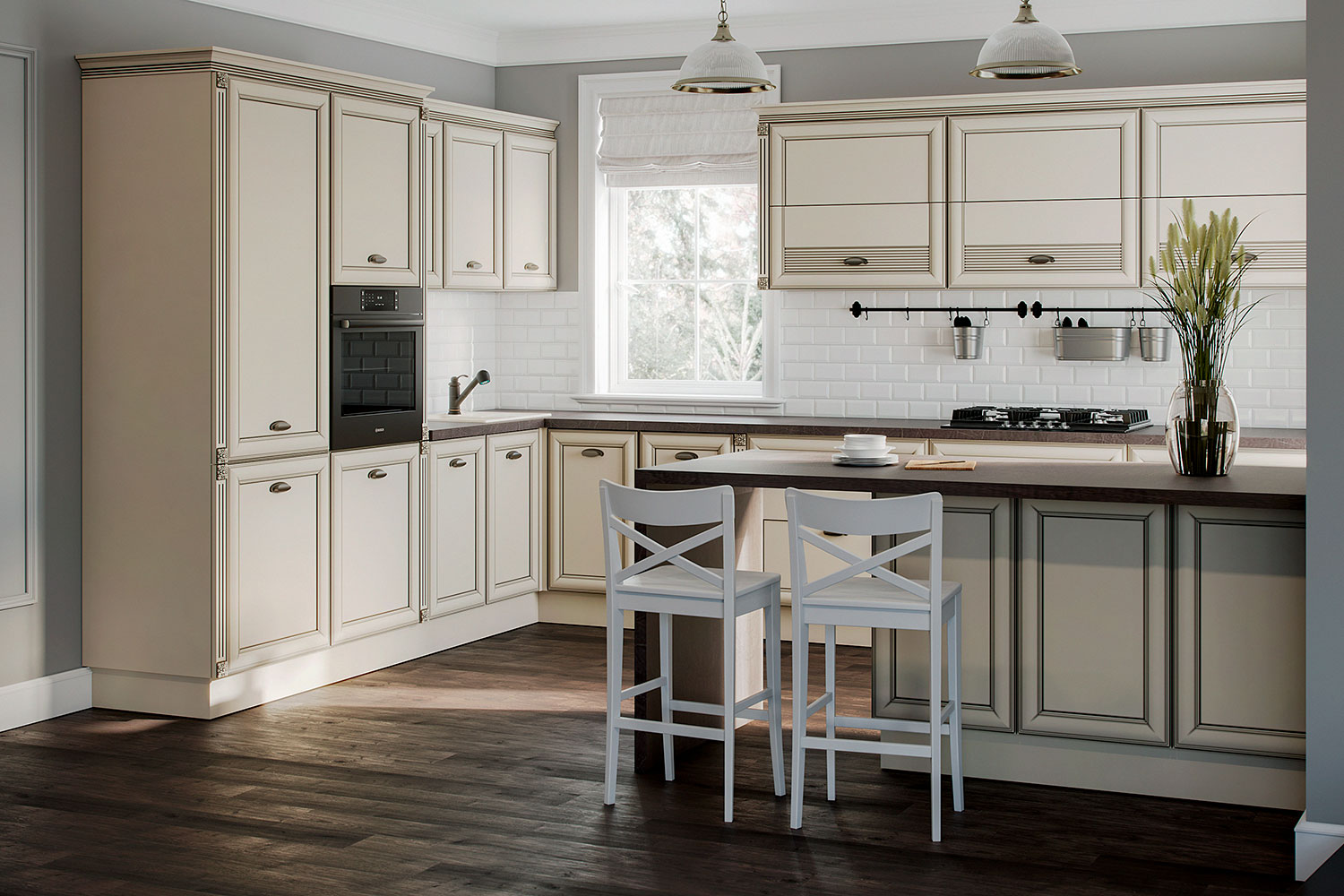 Индивидуальный дизайн этой коллекции заключается в богатых декоративных элементах, которые наполняют кухню жизнью. В коллекции Изотта уникальное исполнение фасадов — патинированные матовые поверхности с тонкой и изящной фрезеровкой. Уютный стеклянный шкаф с подсветкой украшают пространство. Каждая деталь тщательно продумана.