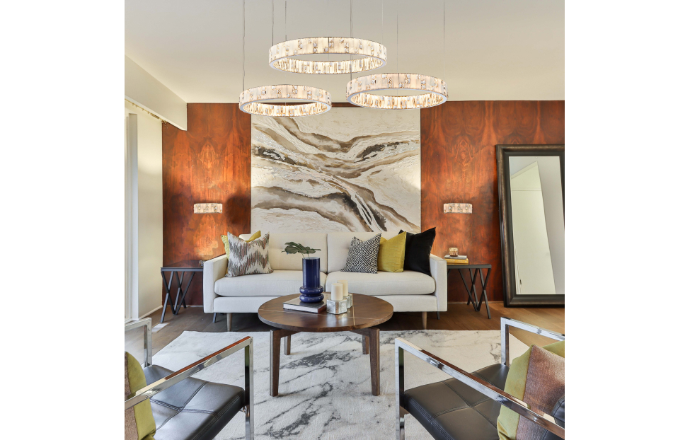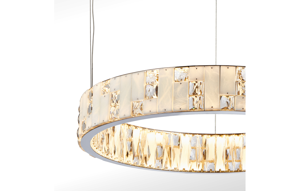 Конструкция люстр в виде колец на тросовых подвесах добавит в интерьер особый шарм и легкость. Хромированная отделка придает этим светильникам современный вид и отражает свет, создавая игру бликов и отражений. Декор в виде тонких пластин из белого мрамора придает изысканный и шикарный вид, особый блеск и нежность. Прозрачные вставки из хрусталя добавляют дополнительную яркость и контрастность. Люстры из этой коллекции создают изумительное освещение и станут прекрасным украшением вашего интерьера. Они идеально впишутся в современный дизайн гостиной, столовой или спальни.