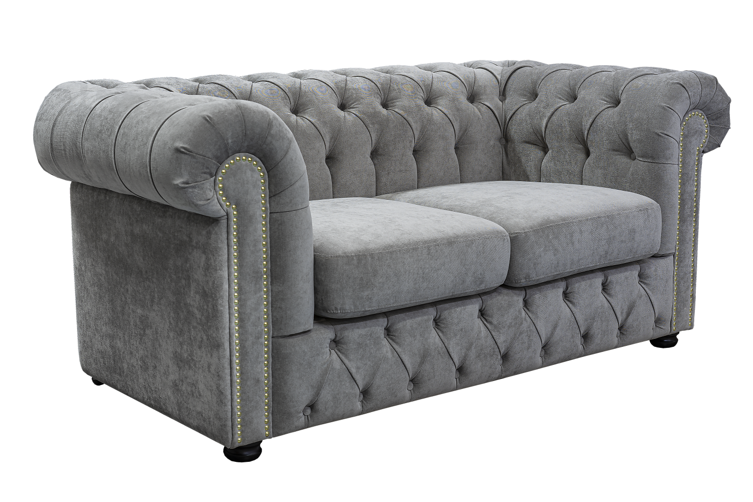 Яркая харизматичная модель украсит интерьер в стиле постмодернизм, ретро, эклектика. Традиционные элементы английской классики — подлокотники в виде свитков, низкая спинка, стяжка «капитоне», декоративные гвоздики — удивительным образом гармонируют с серым оттенком обивки. Качественный мебельный микровельвет обладает изысканной, переливчатой фактурой, неприхотлив в уходе, устойчив к действию солнечного ультрафиолета. Отстрочка выполнена прочной армированной нитью.